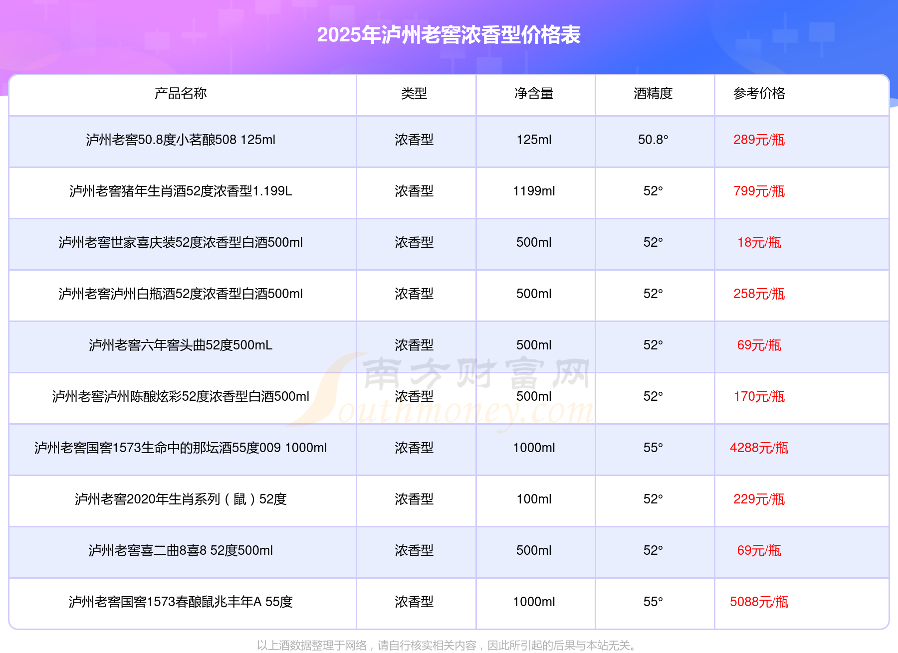 2025年泸州老窖浓香型价格最高的酒是泸州老窖国窖1573春酿鼠兆丰年E 55度,参考价17999元/瓶,最低的是泸州老窖45度五洲醉8窖经典小酒版浓香型100ml,参考价10元/瓶,价格高低差为17989元/瓶。