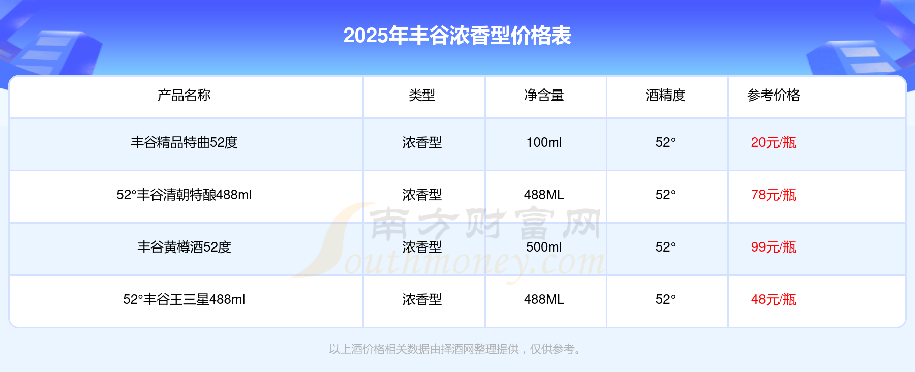 丰谷黄樽酒52度参考价99元/瓶、52°丰谷清朝特酿488ml参考价78元/瓶、52°丰谷王三星488ml参考价48元/瓶、丰谷精品特曲52度参考价20元/瓶。