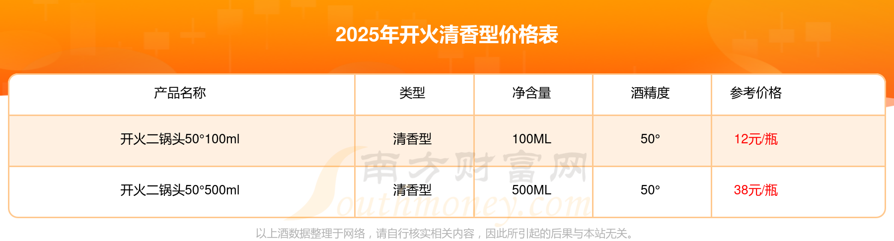 2025开火清香型酒最新价格:开火二锅头50°500ml参考价38元/瓶、开火二锅头50°100ml参考价12元/瓶。