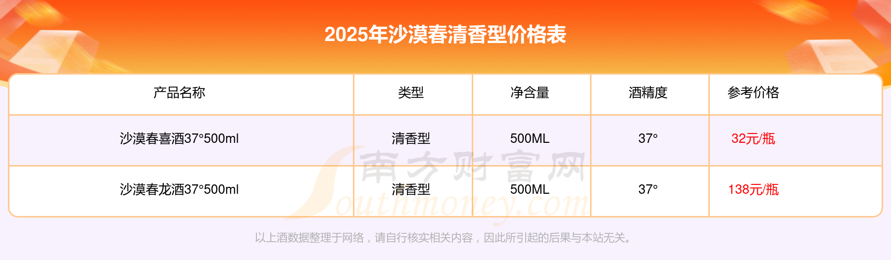 2025年,沙漠春龙酒37°500ml、沙漠春喜酒37°500ml等沙漠春清香型酒价格如下:沙漠春龙酒37°500ml参考价138元/瓶、沙漠春喜酒37°500ml参考价32元/瓶。
