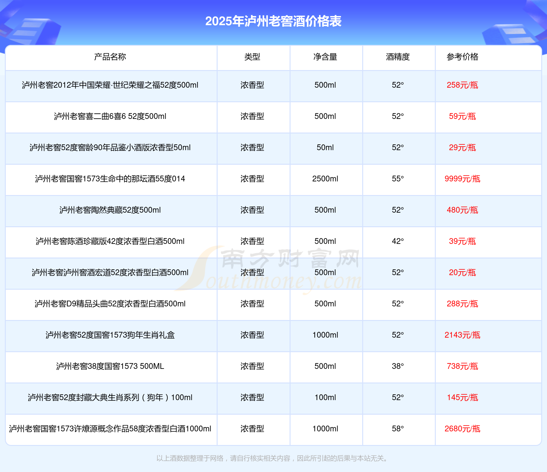 目前,泸州老窖酒价格最高的酒为泸州老窖国窖1573春酿鼠兆丰年E 55度,参考价17999元/瓶,而泸州老窖酒价格最低的是泸州老窖45度五洲醉8窖经典小酒版浓香型100ml,参考价10元/瓶,价格高低差为17989元/瓶。