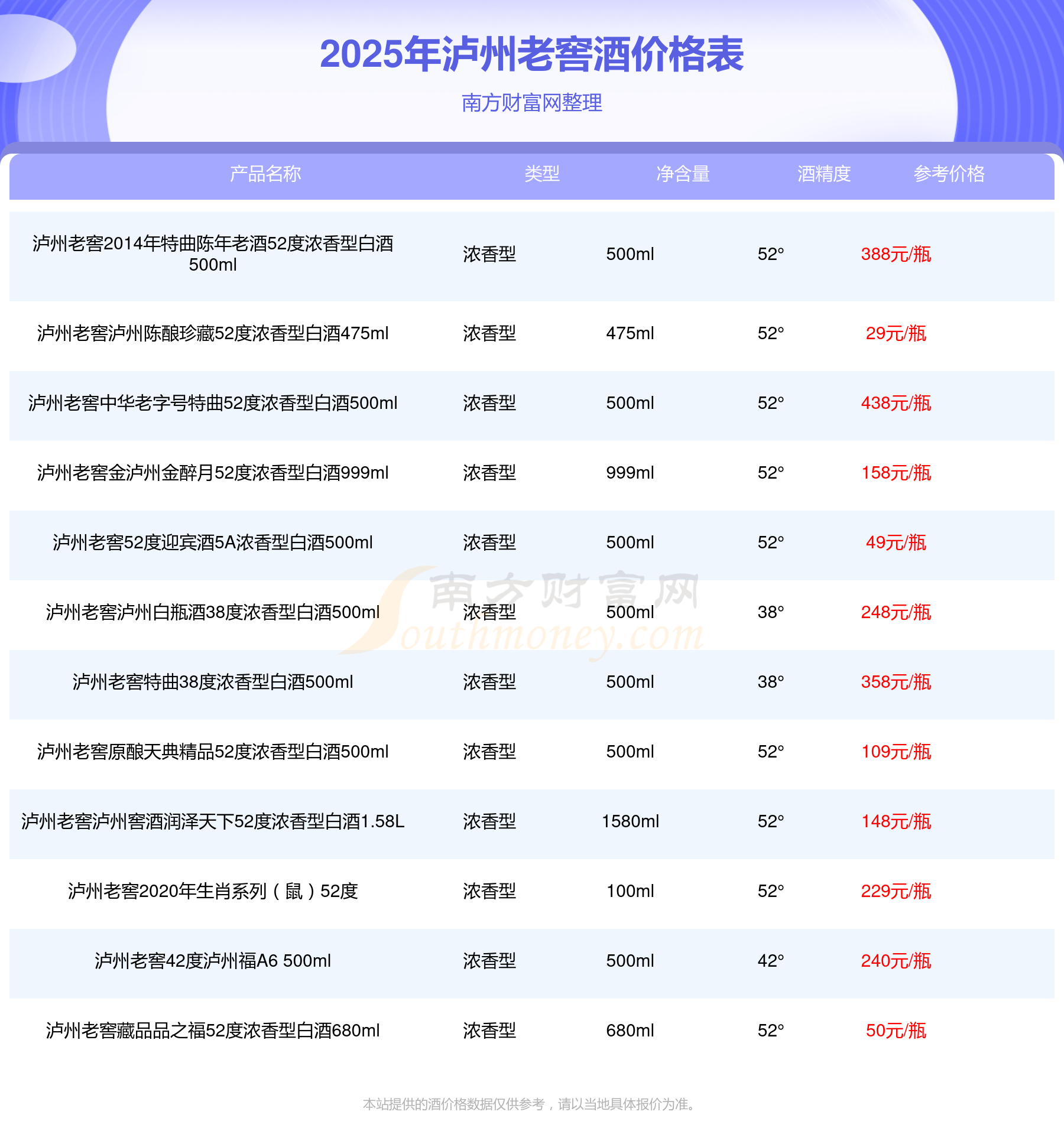 2025年泸州老窖酒泸州老窖国窖1573春酿鼠兆丰年E 55度、泸州老窖国窖1573生命中的那坛酒55度014、泸州老窖国窖1573春酿鼠兆丰年A 55度、泸州老窖国窖1573生命中的那坛酒55度013浓香型白酒1000ml、泸州老窖国窖1573生命中的那坛酒55度009 1000ml、泸州老窖国窖1573中国品味52度浓香型白酒500ml、泸州老窖国窖1573许燎源概念作品58度浓香型白酒1000ml等最新价格如下:泸州老窖国窖1573春酿鼠兆丰年E 55度参考价17999元/瓶、泸州老窖国窖1573生命中的那坛酒55度014参考价9999元/瓶、泸州老窖国窖1573春酿鼠兆丰年A 55度参考价5088元/瓶、泸州老窖国窖1573生命中的那坛酒55度013浓香型白酒1000ml参考价4988元/瓶、泸州老窖国窖1573生命中的那坛酒55度009 1000ml参考价4288元/瓶、泸州老窖国窖1573中国品味52度浓香型白酒500ml参考价2888元/瓶、泸州老窖国窖1573许燎源概念作品58度浓香型白酒1000ml参考价2680元/瓶。