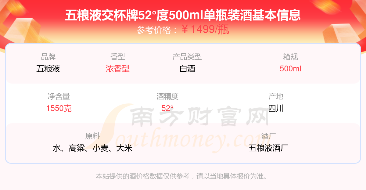 五粮液交杯牌52°度500ml单瓶装基本信息