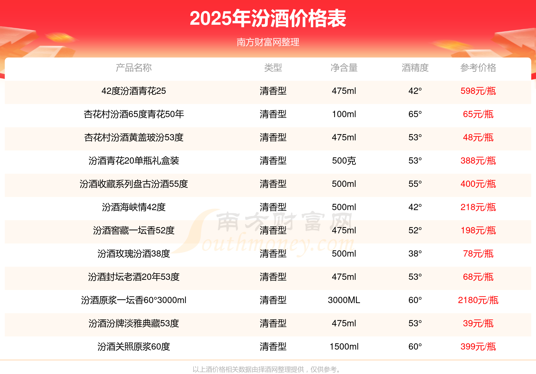2025汾酒最新价格:汾酒原浆一坛香60°3000ml参考价2180元/瓶、汾酒原浆一坛香60°1500ml参考价1536元/瓶、42度汾酒青花25参考价598元/瓶。