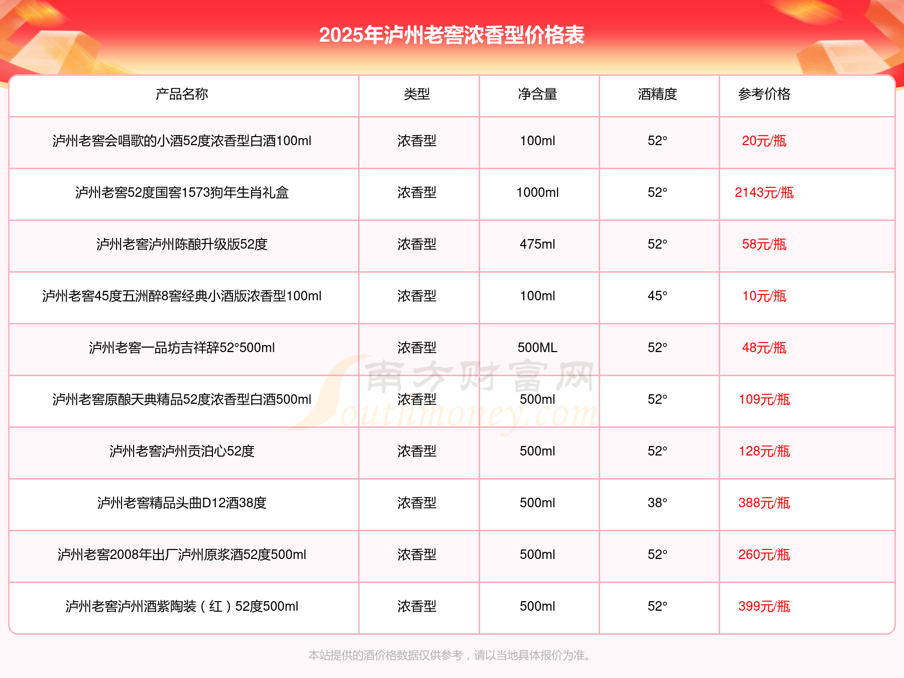 2025年泸州老窖浓香型酒泸州老窖国窖1573春酿鼠兆丰年E 55度、泸州老窖国窖1573生命中的那坛酒55度014、泸州老窖国窖1573春酿鼠兆丰年A 55度、泸州老窖国窖1573生命中的那坛酒55度013浓香型白酒1000ml、泸州老窖国窖1573生命中的那坛酒55度009 1000ml、泸州老窖国窖1573中国品味52度浓香型白酒500ml等最新价格如下:泸州老窖国窖1573春酿鼠兆丰年E 55度参考价17999元/瓶、泸州老窖国窖1573生命中的那坛酒55度014参考价9999元/瓶、泸州老窖国窖1573春酿鼠兆丰年A 55度参考价5088元/瓶、泸州老窖国窖1573生命中的那坛酒55度013浓香型白酒1000ml参考价4988元/瓶、泸州老窖国窖1573生命中的那坛酒55度009 1000ml参考价4288元/瓶、泸州老窖国窖1573中国品味52度浓香型白酒500ml参考价2888元/瓶。