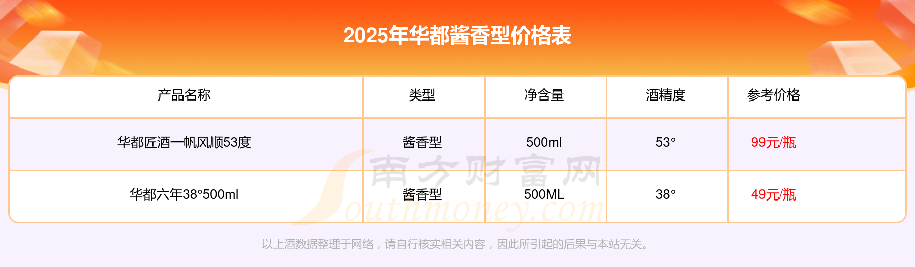 华都匠酒一帆风顺53度参考价99元/瓶、华都六年38°500ml参考价49元/瓶。