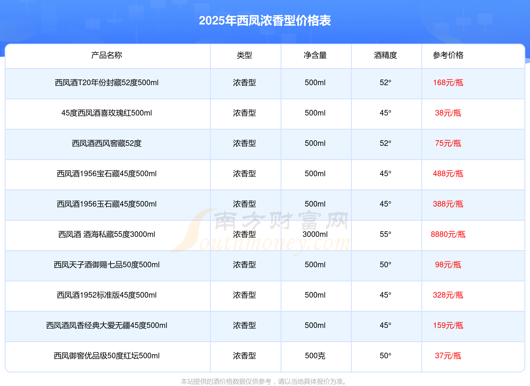 2025年,西凤酒 酒海私藏55度3000ml、西凤酒1952金奖50 55度500ml、西凤酒2013年产老酒凤香经典30年52度500ml、西凤酒1952金奖30 55度500ml、西凤酒凤香经典20年52度500ml、西凤酒1952金奖30 45度500ml、西凤酒1956纪念版52度500ml等西凤浓香型酒价格如下:西凤酒 酒海私藏55度3000ml参考价8880元/瓶、西凤酒1952金奖50 55度500ml参考价2380元/瓶、西凤酒2013年产老酒凤香经典30年52度500ml参考价1280元/瓶、西凤酒1952金奖30 55度500ml参考价898元/瓶、西凤酒凤香经典20年52度500ml参考价768元/瓶、西凤酒1952金奖30 45度500ml参考价658元/瓶、西凤酒1956纪念版52度500ml参考价498元/瓶。