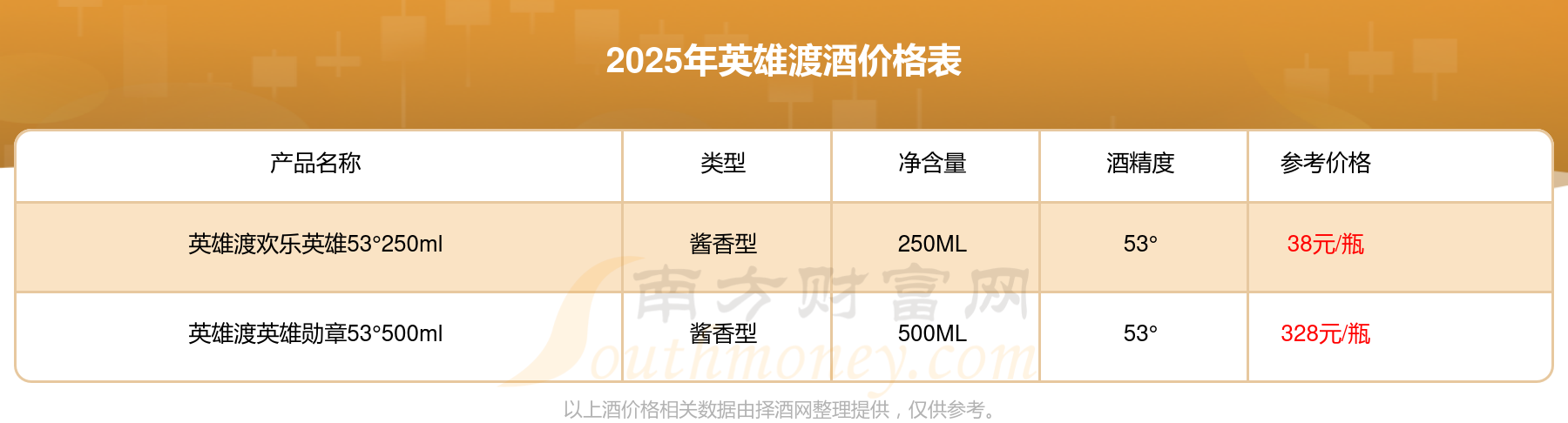 2025年,英雄渡英雄勋章53°500ml、英雄渡欢乐英雄53°250ml等英雄渡酒价格如下: