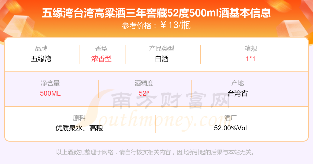 五缘湾台湾高粱酒三年窖藏52度500ml基本信息