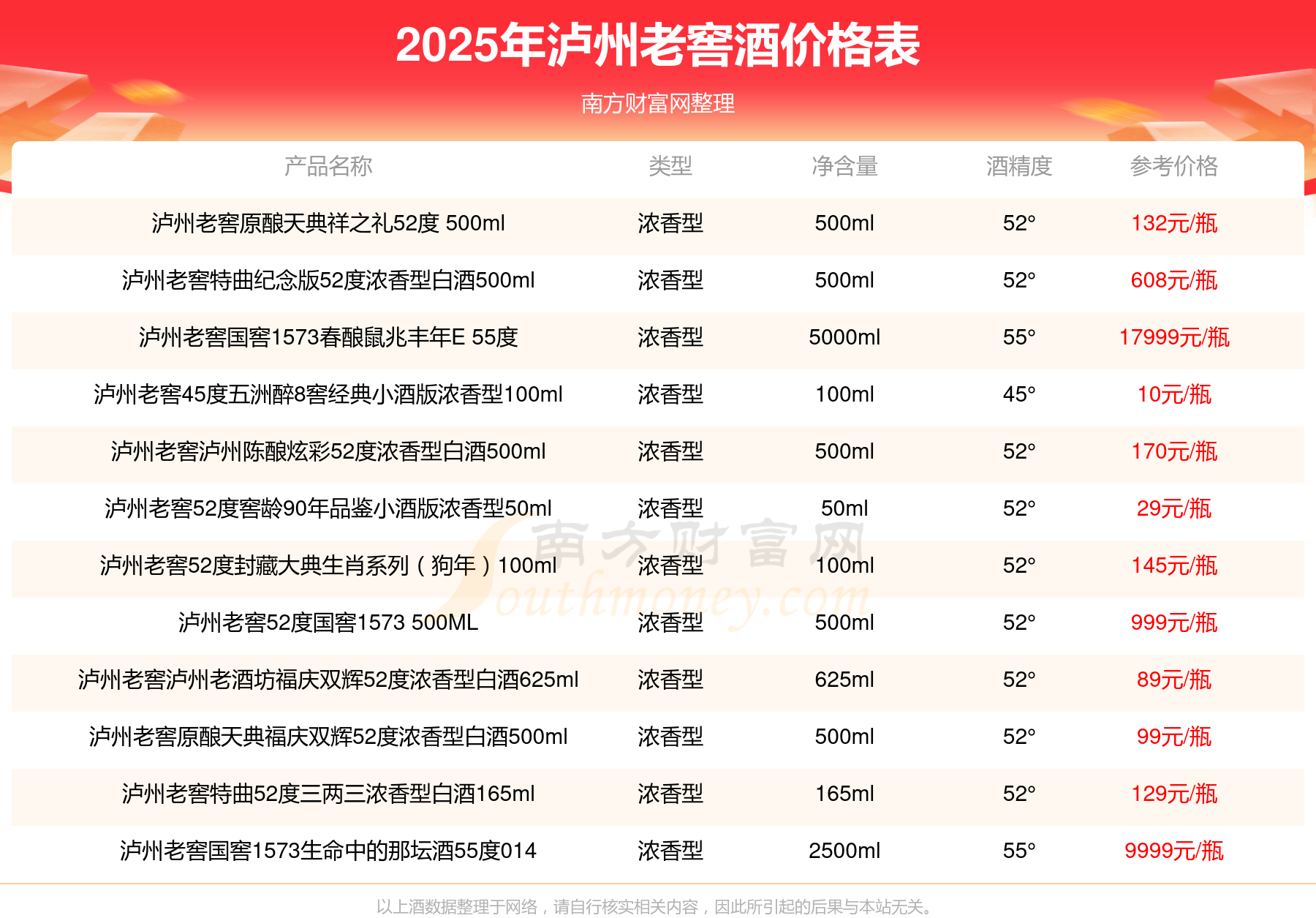 2025年,泸州老窖国窖1573春酿鼠兆丰年E 55度、泸州老窖国窖1573生命中的那坛酒55度014、泸州老窖国窖1573春酿鼠兆丰年A 55度、泸州老窖国窖1573生命中的那坛酒55度013浓香型白酒1000ml等泸州老窖酒价格如下: