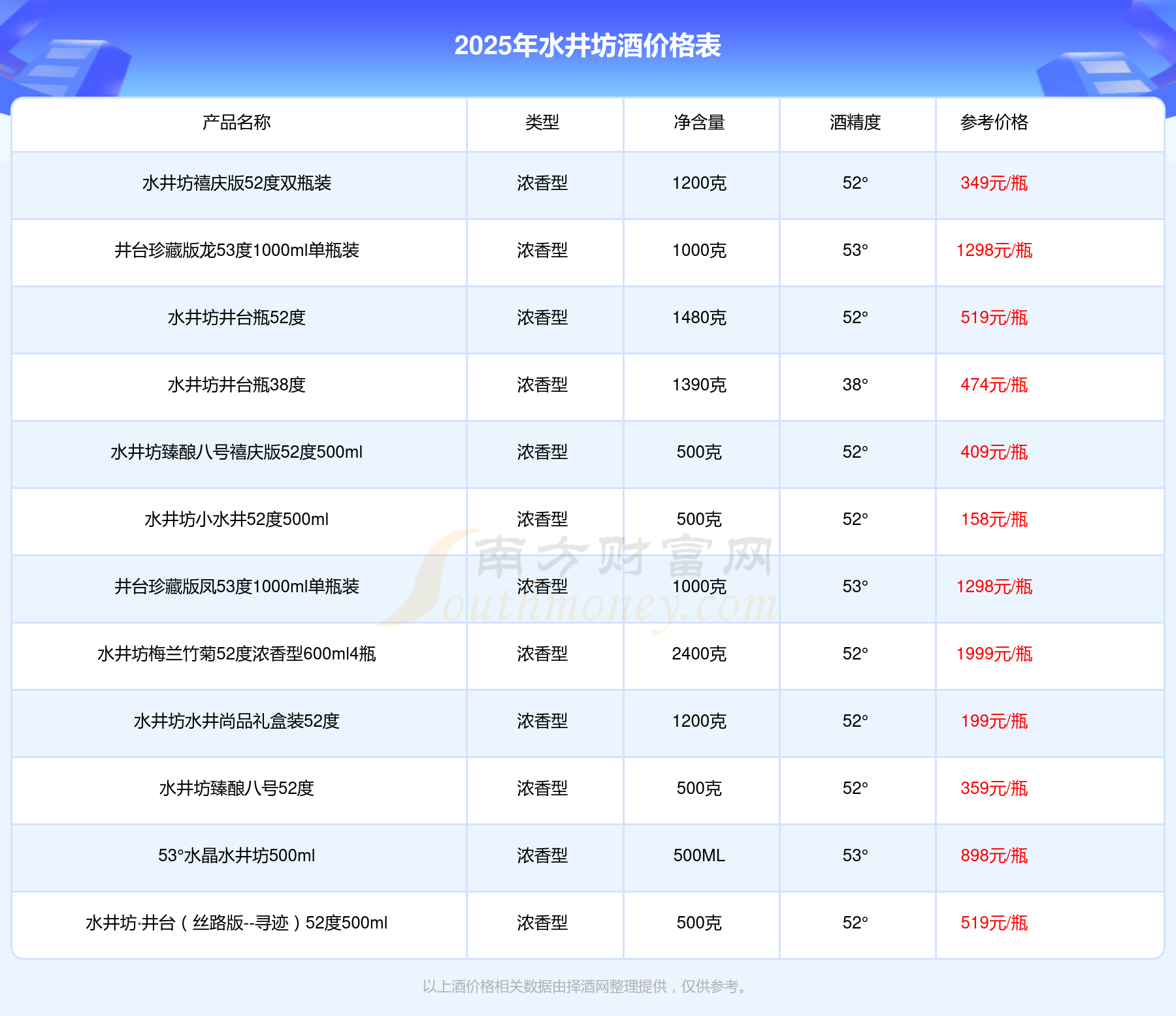 2025年,水井坊酒价格最高的是水井坊大坛收藏级原浆天球瓶66度,参考价13999元,最低的是水井坊小水井52度500ml,参考价158元,价格高低差为13841元。