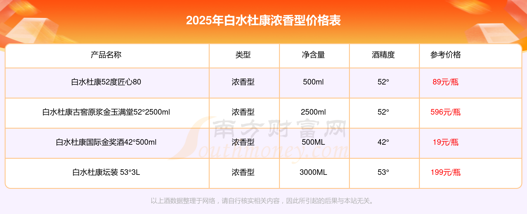 2025白水杜康浓香型酒最新价格:白水杜康古窖原浆金玉满堂52°2500ml参考价596元/瓶、白水杜康坛装 53°3L参考价199元/瓶、白水杜康52度匠心80参考价89元/瓶、白水杜康国际金奖酒42°500ml参考价19元/瓶。