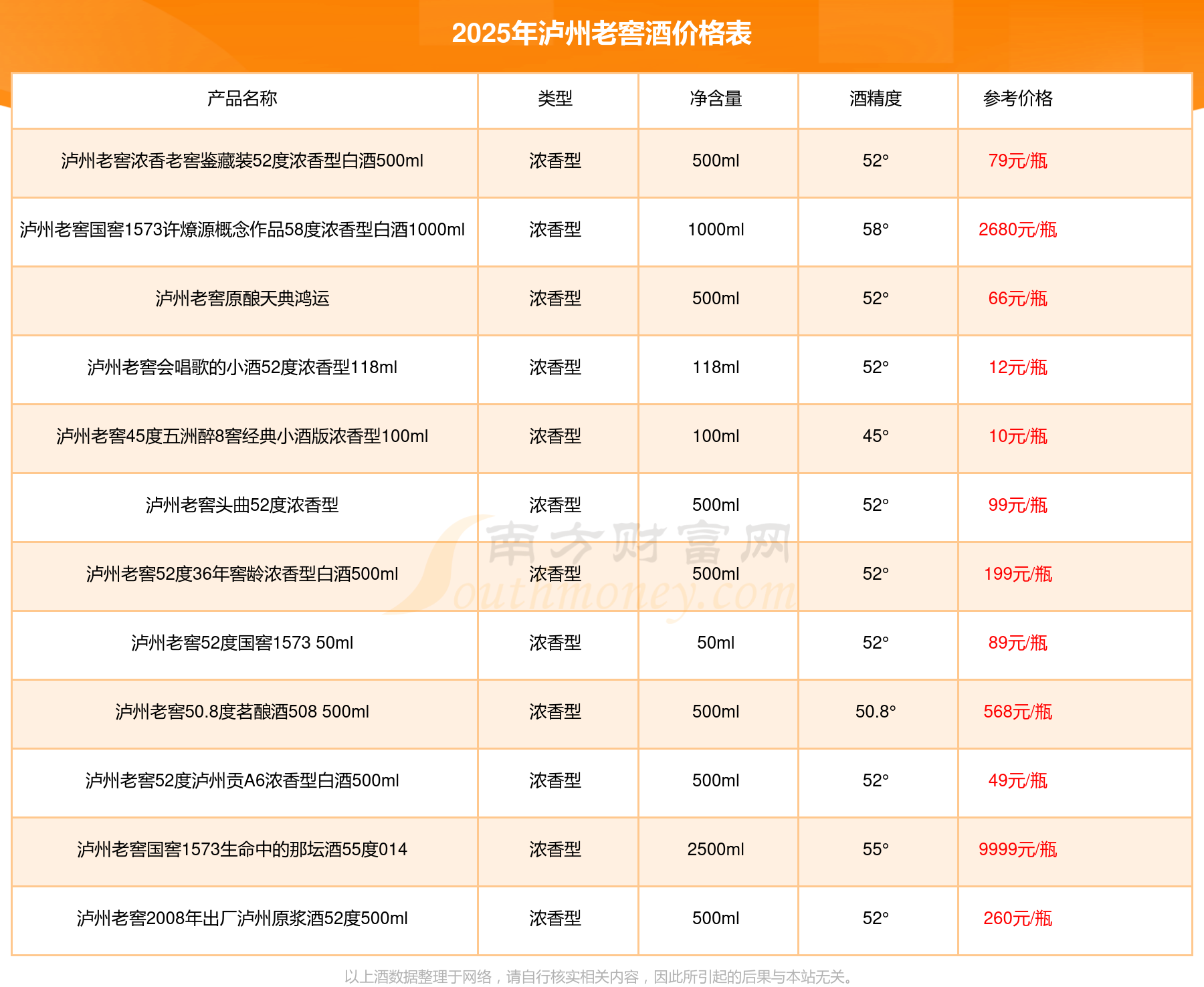 2025泸州老窖酒最新价格:泸州老窖国窖1573春酿鼠兆丰年E 55度参考价17999元/瓶、泸州老窖国窖1573生命中的那坛酒55度014参考价9999元/瓶、泸州老窖国窖1573春酿鼠兆丰年A 55度参考价5088元/瓶、泸州老窖国窖1573生命中的那坛酒55度013浓香型白酒1000ml参考价4988元/瓶、泸州老窖国窖1573生命中的那坛酒55度009 1000ml参考价4288元/瓶、泸州老窖国窖1573中国品味52度浓香型白酒500ml参考价2888元/瓶、泸州老窖国窖1573许燎源概念作品58度浓香型白酒1000ml参考价2680元/瓶。