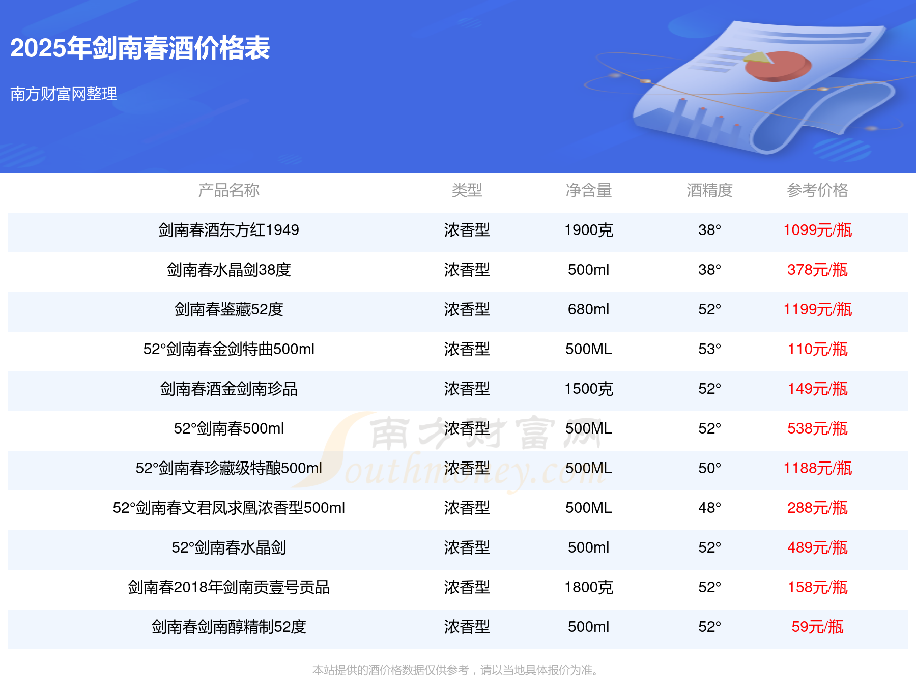 2025年剑南春酒剑南春鉴藏52度、52°剑南春珍藏级特酿500ml、剑南春酒东方红1949、52°剑南春500ml、52°剑南春水晶剑等最新价格如下:剑南春鉴藏52度参考价1199元/瓶、52°剑南春珍藏级特酿500ml参考价1188元/瓶、剑南春酒东方红1949参考价1099元/瓶、52°剑南春500ml参考价538元/瓶、52°剑南春水晶剑参考价489元/瓶。