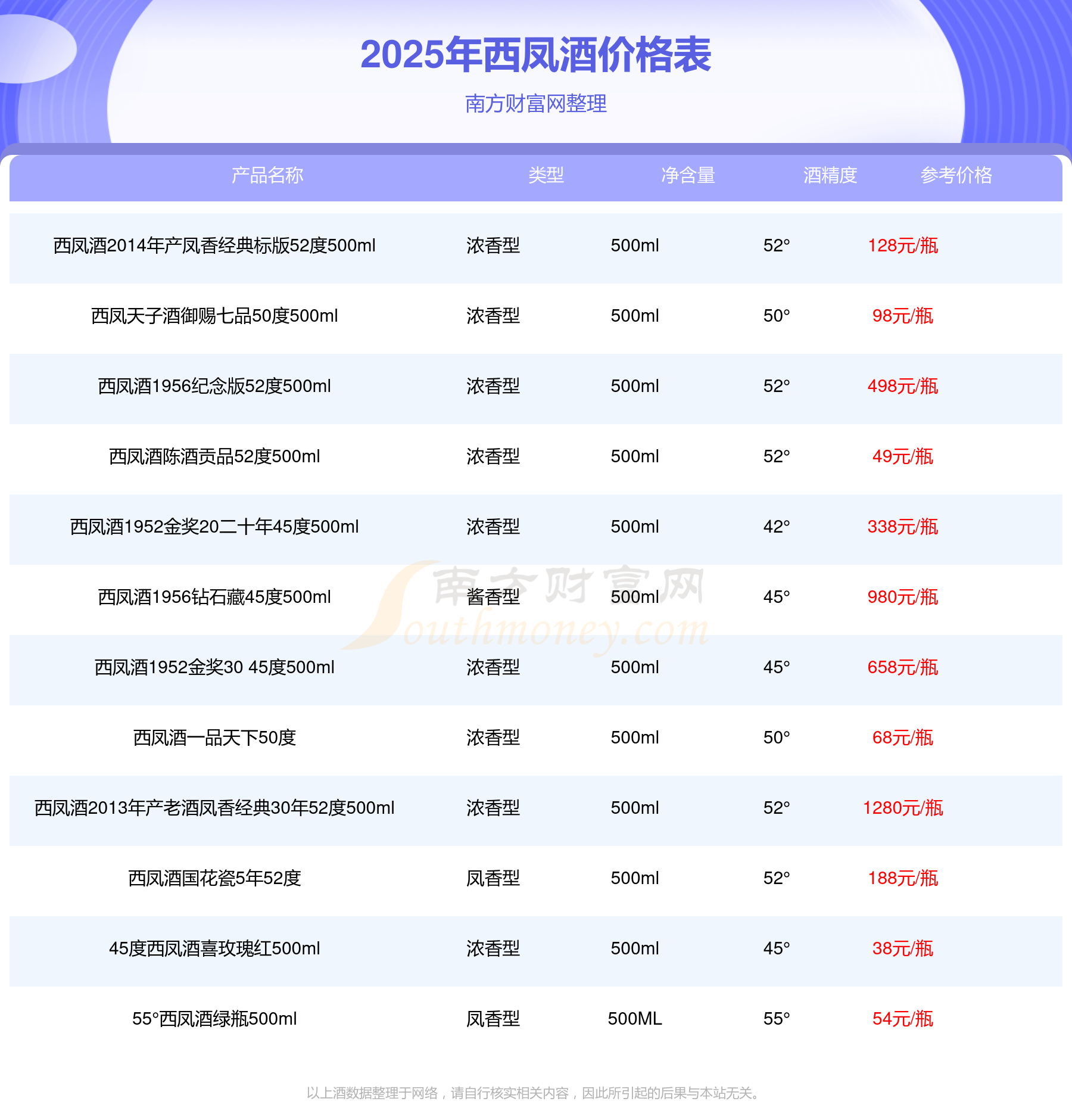 2025西凤酒最新价格:西凤酒 酒海私藏55度3000ml参考价8880元/瓶、西凤酒1952金奖50 55度500ml参考价2380元/瓶、西凤酒2013年产老酒凤香经典30年52度500ml参考价1280元/瓶、西凤酒1956钻石藏45度500ml参考价980元/瓶、西凤酒1952金奖30 55度500ml参考价898元/瓶、西凤酒凤香经典20年52度500ml参考价768元/瓶、西凤酒1952金奖30 45度500ml参考价658元/瓶。