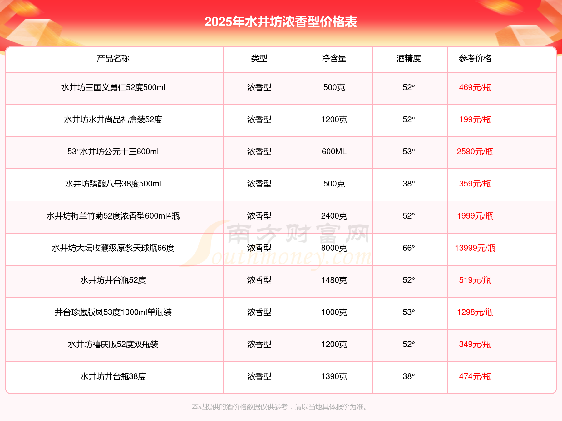水井坊大坛收藏级原浆天球瓶66度参考价13999元/瓶、水井坊博物馆壹号53度双瓶装参考价10988元/瓶、53°水井坊公元十三600ml参考价2580元/瓶、水井坊梅兰竹菊52度浓香型600ml4瓶参考价1999元/瓶、水井坊菁翠52度500ml参考价1650元/瓶、井台珍藏版龙53度1000ml单瓶装参考价1298元/瓶、井台珍藏版凤53度1000ml单瓶装参考价1298元/瓶。