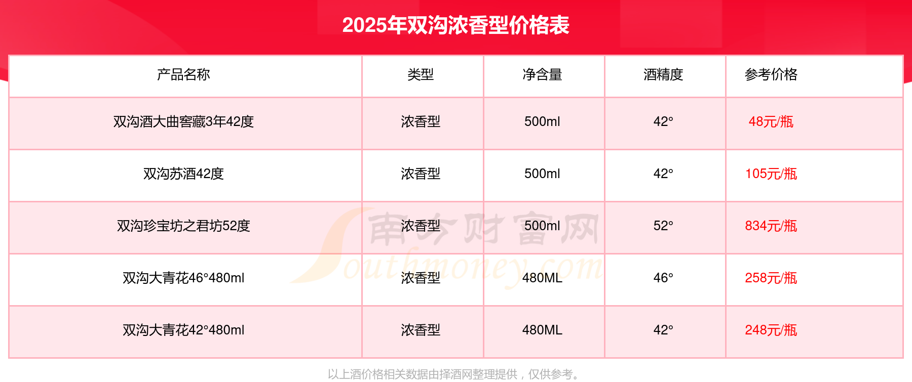 2025年,双沟浓香型酒价格最高的是双沟珍宝坊之君坊52度,参考价834元,最低的是双沟酒大曲窖藏3年42度,参考价48元,价格高低差为786元。
