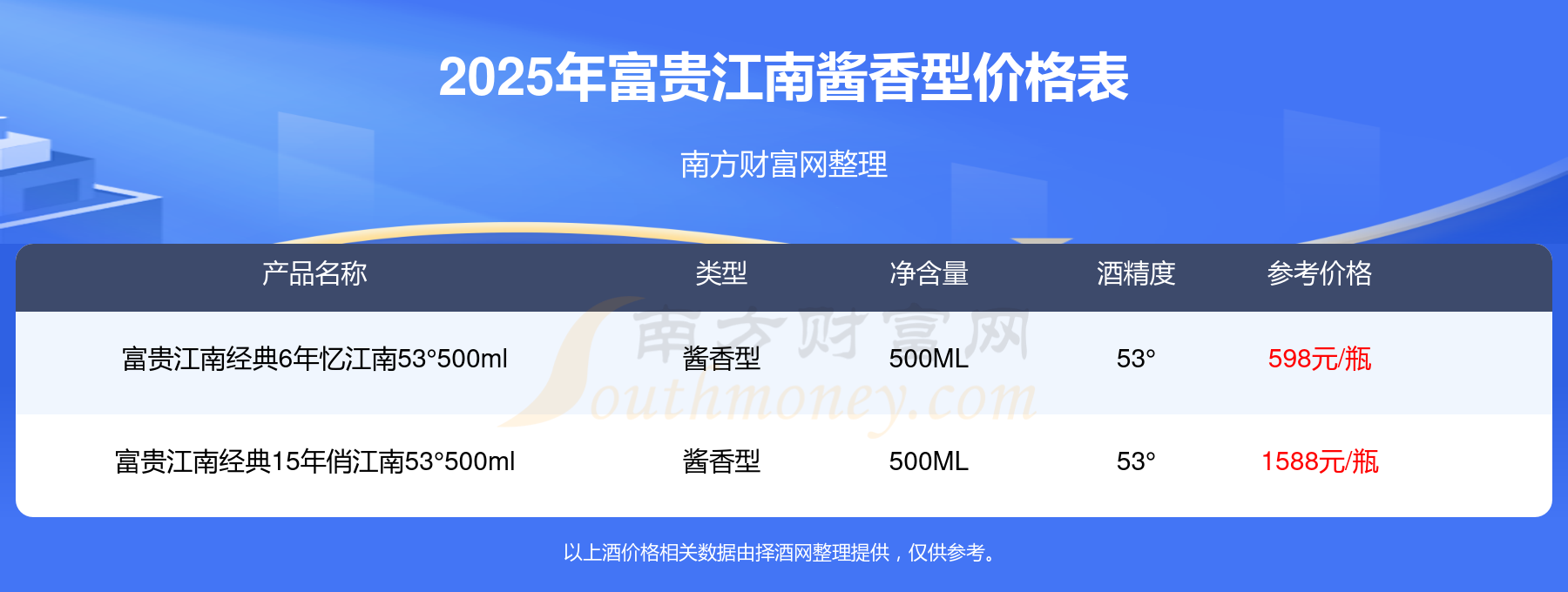 2025年富贵江南酱香型酒富贵江南经典15年俏江南53°500ml、富贵江南经典6年忆江南53°500ml等最新价格如下:富贵江南经典15年俏江南53°500ml参考价1588元/瓶、富贵江南经典6年忆江南53°500ml参考价598元/瓶。