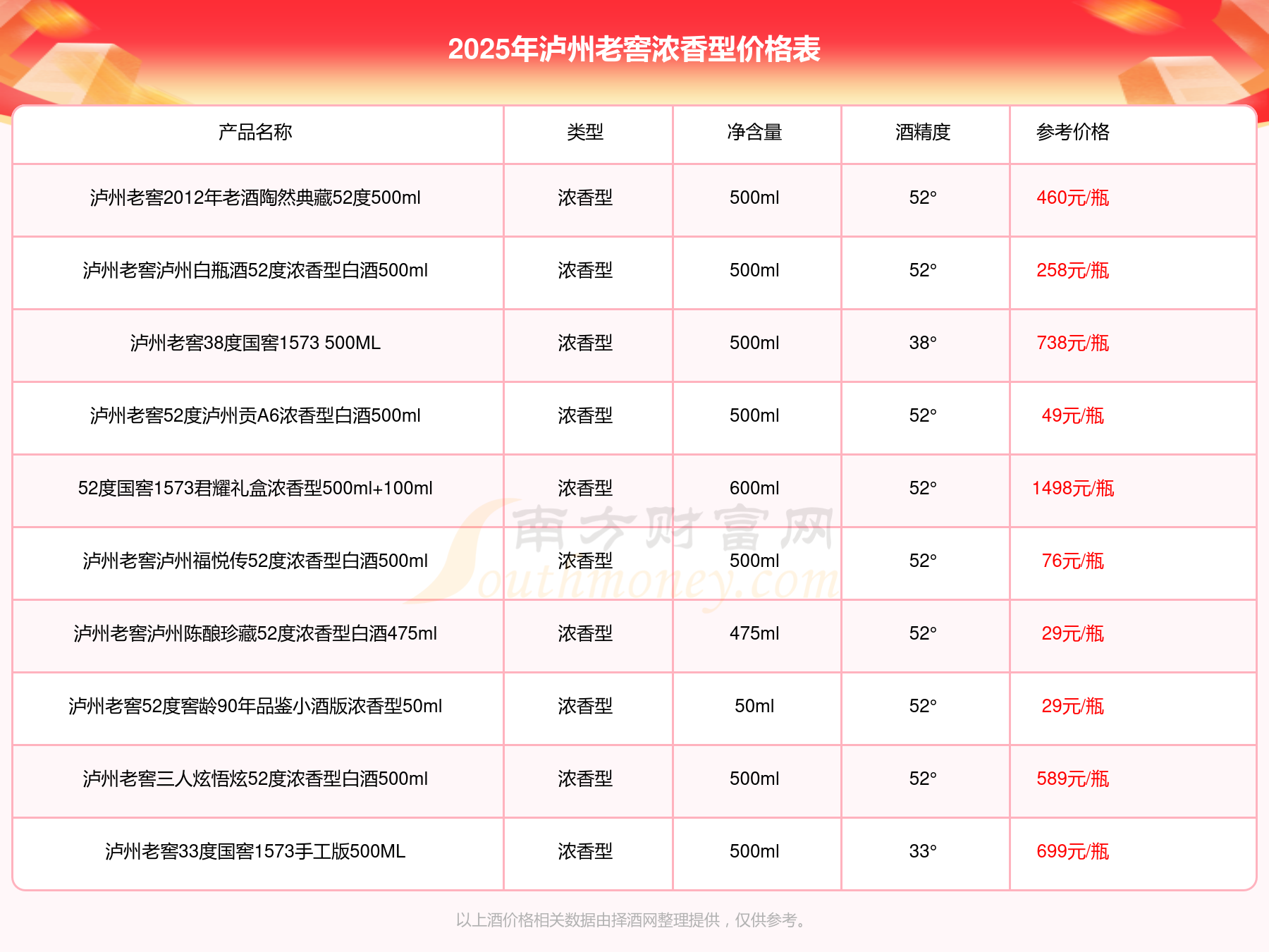 2025年,泸州老窖国窖1573春酿鼠兆丰年E 55度、泸州老窖国窖1573生命中的那坛酒55度014、泸州老窖国窖1573春酿鼠兆丰年A 55度、泸州老窖国窖1573生命中的那坛酒55度013浓香型白酒1000ml等泸州老窖浓香型酒价格如下:泸州老窖国窖1573春酿鼠兆丰年E 55度参考价17999元/瓶、泸州老窖国窖1573生命中的那坛酒55度014参考价9999元/瓶、泸州老窖国窖1573春酿鼠兆丰年A 55度参考价5088元/瓶、泸州老窖国窖1573生命中的那坛酒55度013浓香型白酒1000ml参考价4988元/瓶。