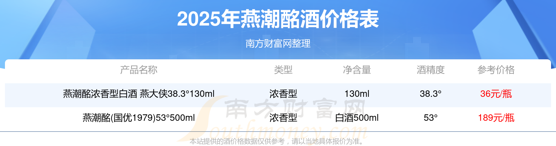 燕潮酩酒最新价格2025:燕潮酩(国优1979)53°500ml参考价189元/瓶、燕潮酩浓香型白酒 燕大侠38.3°130ml参考价36元/瓶。
