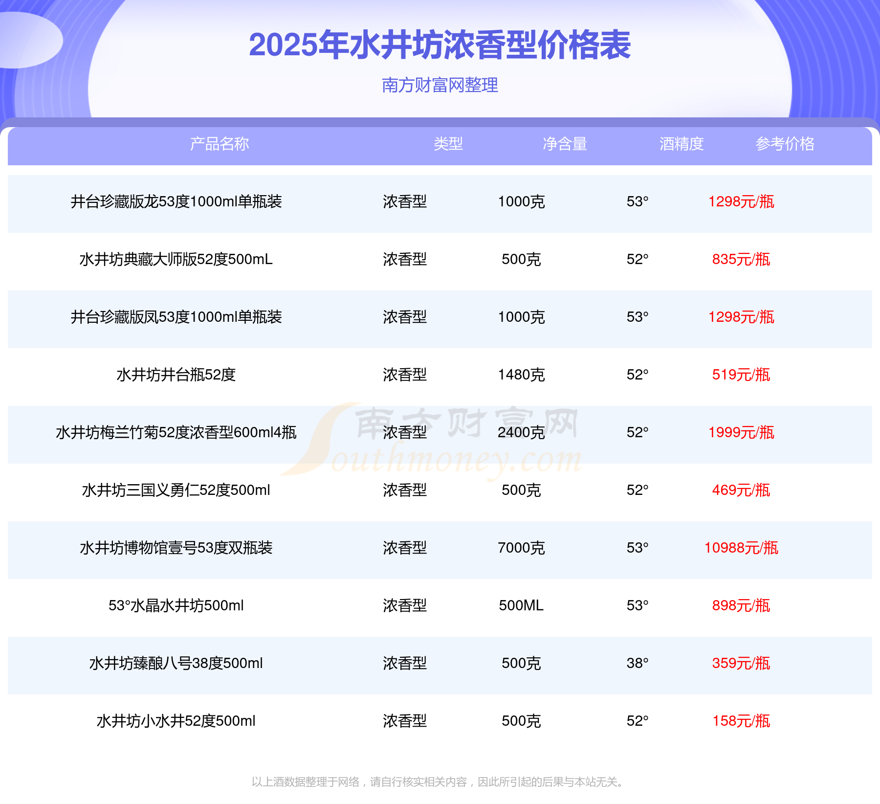 水井坊浓香型酒最新价格2025:水井坊大坛收藏级原浆天球瓶66度参考价13999元/瓶、水井坊博物馆壹号53度双瓶装参考价10988元/瓶、53°水井坊公元十三600ml参考价2580元/瓶、水井坊梅兰竹菊52度浓香型600ml4瓶参考价1999元/瓶。