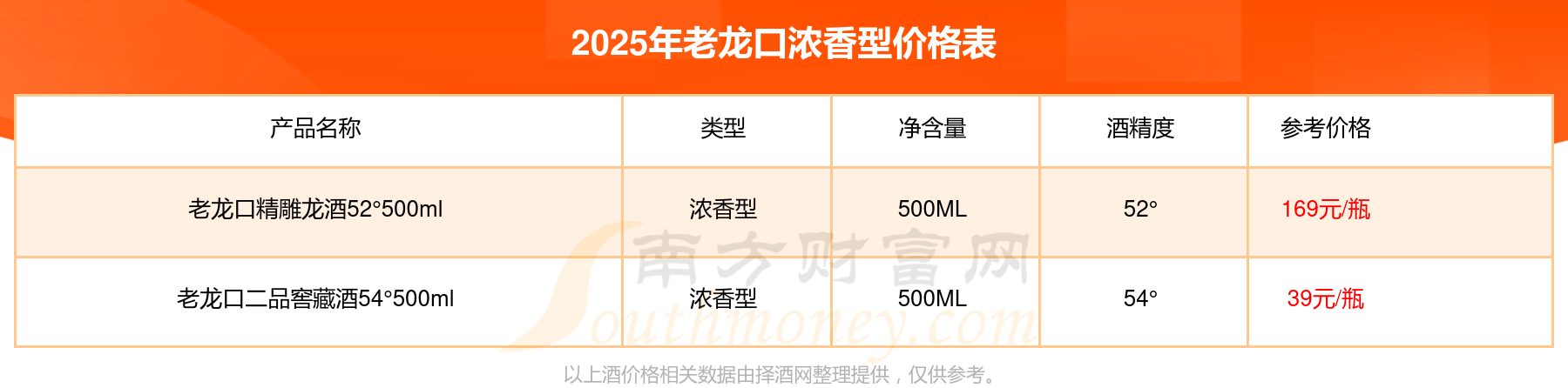 2025年老龙口浓香型酒老龙口精雕龙酒52°500ml、老龙口二品窖藏酒54°500ml等最新价格如下:老龙口精雕龙酒52°500ml参考价169元/瓶、老龙口二品窖藏酒54°500ml参考价39元/瓶。
