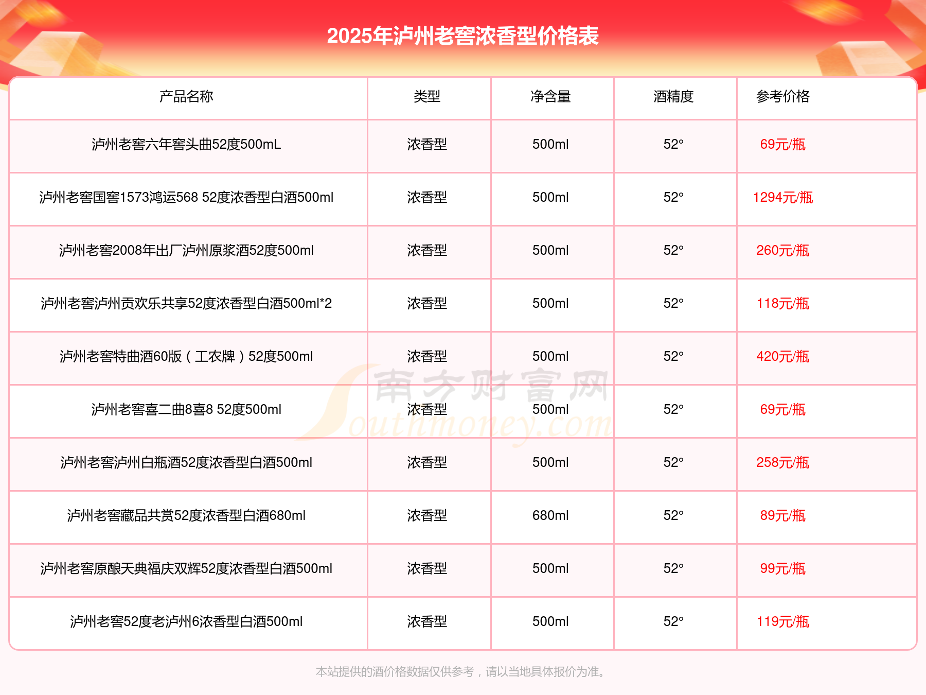 2025年,泸州老窖国窖1573春酿鼠兆丰年E 55度、泸州老窖国窖1573生命中的那坛酒55度014、泸州老窖国窖1573春酿鼠兆丰年A 55度、泸州老窖国窖1573生命中的那坛酒55度013浓香型白酒1000ml、泸州老窖国窖1573生命中的那坛酒55度009 1000ml等泸州老窖浓香型酒价格如下:泸州老窖国窖1573春酿鼠兆丰年E 55度参考价17999元/瓶、泸州老窖国窖1573生命中的那坛酒55度014参考价9999元/瓶、泸州老窖国窖1573春酿鼠兆丰年A 55度参考价5088元/瓶、泸州老窖国窖1573生命中的那坛酒55度013浓香型白酒1000ml参考价4988元/瓶、泸州老窖国窖1573生命中的那坛酒55度009 1000ml参考价4288元/瓶。