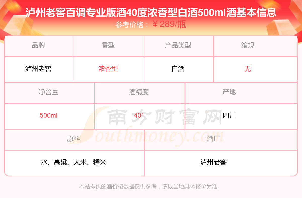 泸州老窖百调专业版酒40度浓香型白酒500ml基本信息