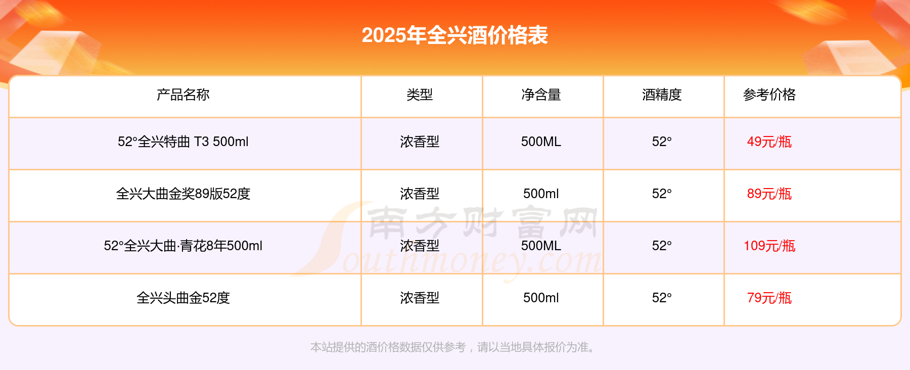 52°全兴大曲·青花8年500ml参考价109元/瓶、全兴大曲金奖89版52度参考价89元/瓶、全兴头曲金52度参考价79元/瓶。