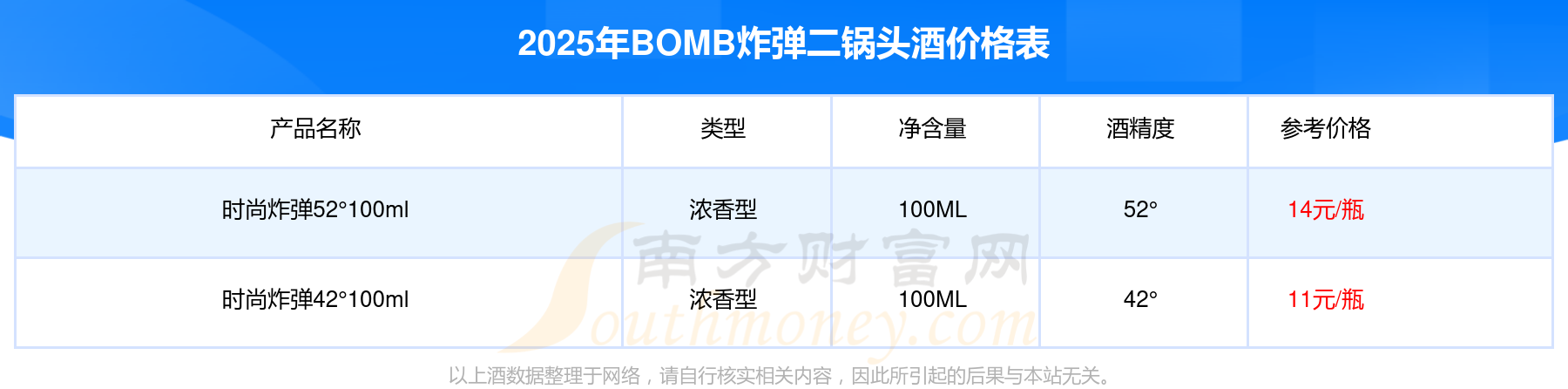 时尚炸弹52°100ml参考价14元/瓶、时尚炸弹42°100ml参考价11元/瓶。