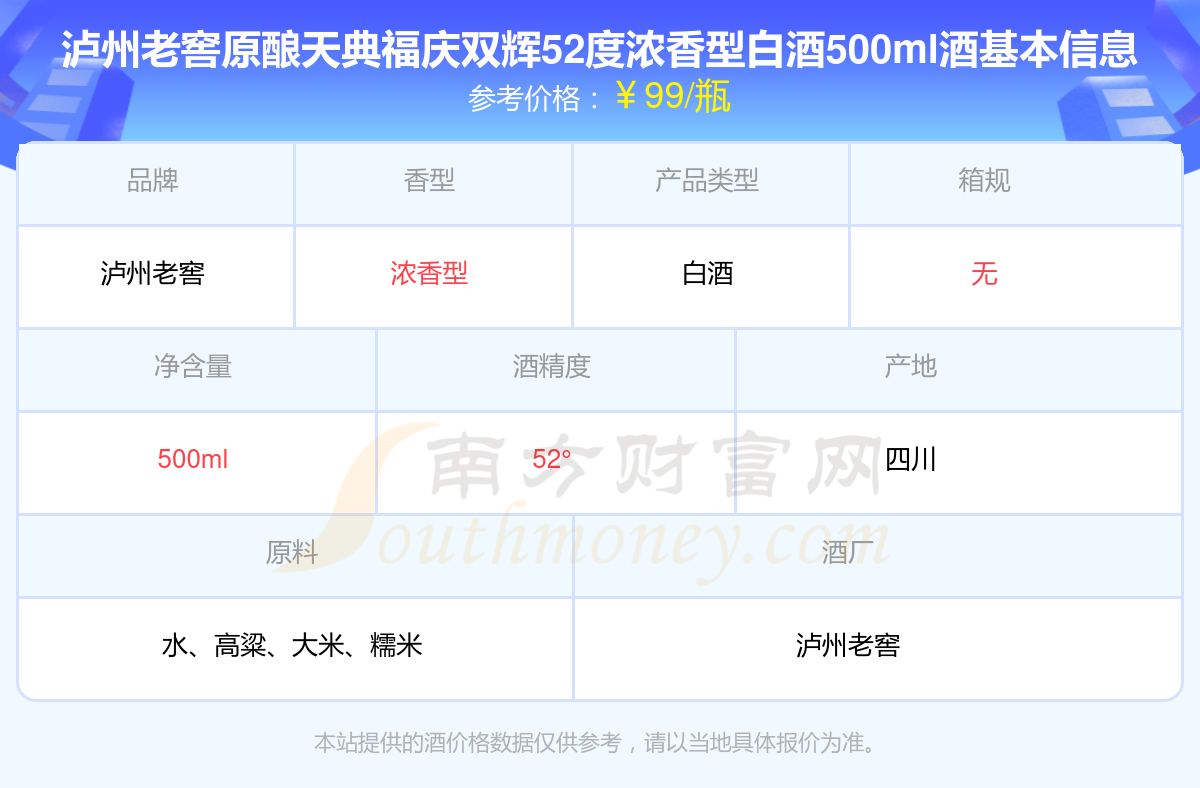 泸州老窖原酿天典福庆双辉52度浓香型白酒500ml基本信息