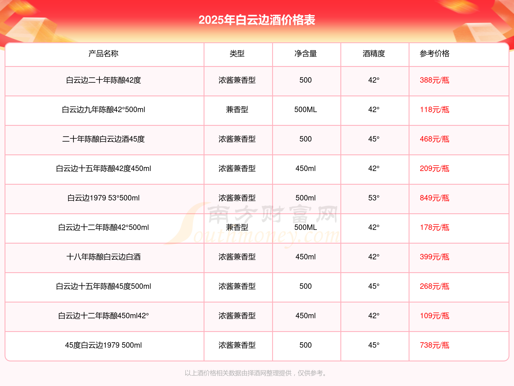 白云边酒价格最高的是白云边1979 53°500ml,参考价849元/瓶,最低的是白云边十二年陈酿450ml42°,参考价109元/瓶,价格高低差为740元/瓶。