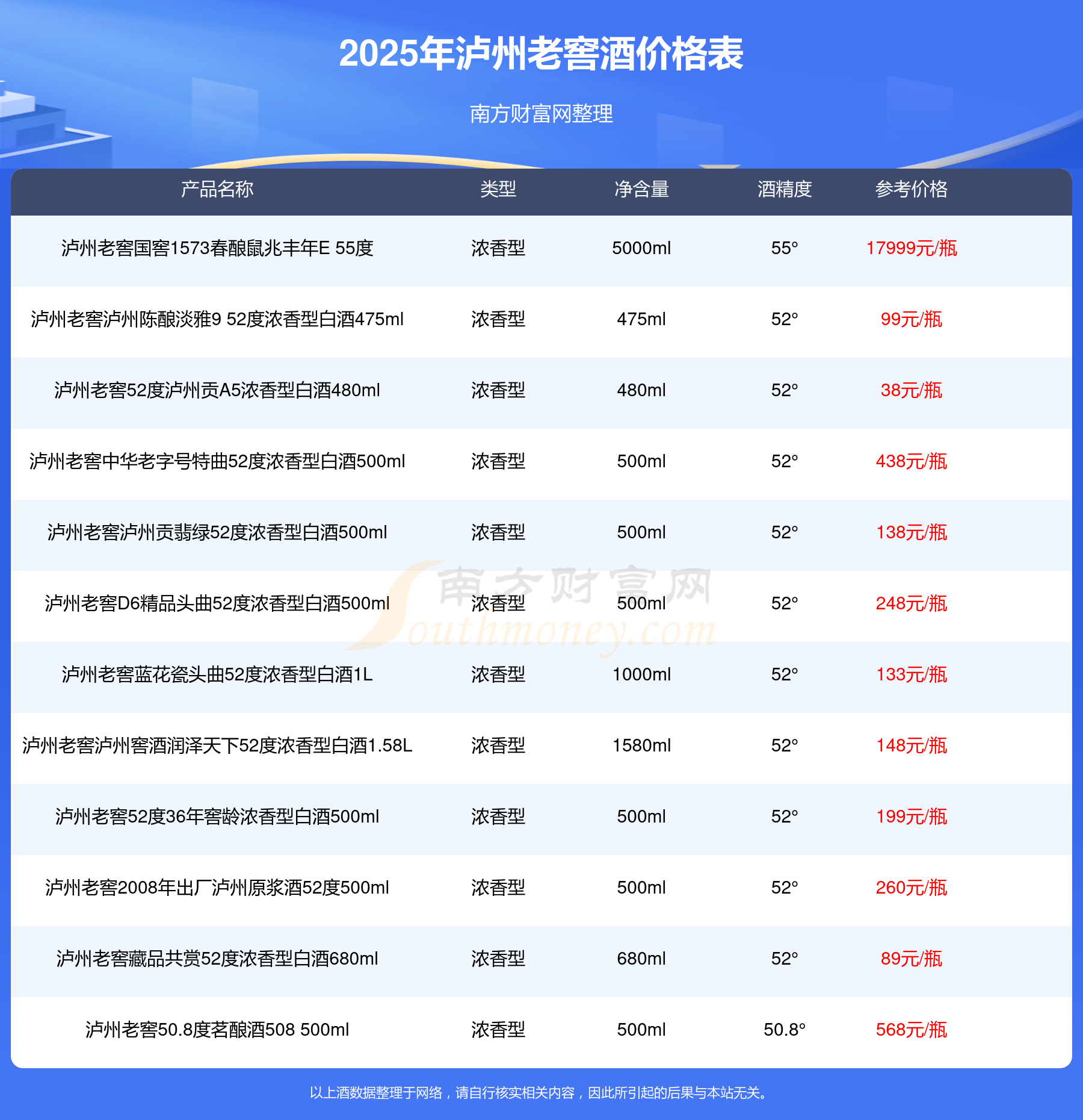 泸州老窖酒最新价格2025:泸州老窖国窖1573春酿鼠兆丰年E 55度参考价17999元/瓶、泸州老窖国窖1573生命中的那坛酒55度014参考价9999元/瓶、泸州老窖国窖1573春酿鼠兆丰年A 55度参考价5088元/瓶、泸州老窖国窖1573生命中的那坛酒55度013浓香型白酒1000ml参考价4988元/瓶。