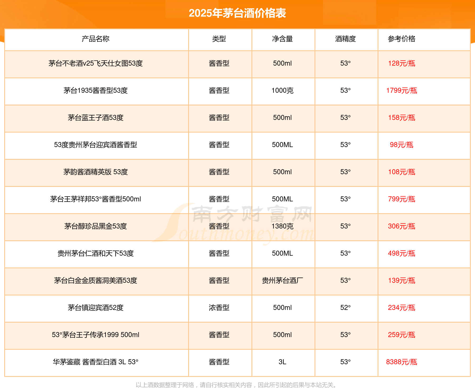 2025年,茅台酒价格最高的是华茅鉴藏 酱香型白酒 3L 53°,参考价8388元,最低的是张义斋52度原浆老窖酒,参考价58元,价格高低差为8330元。