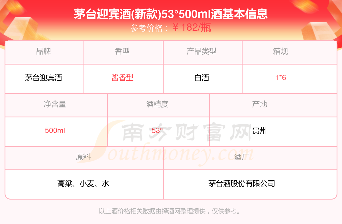 茅台迎宾酒是茅台酒系列产品。是以优质高粱、小麦为原料,秉承茅台酒传统工艺、精心酿造、勾兑而成的优质酱香型白酒。具有酱香明显、幽雅舒适、协调醇和、回味较长、空杯留香,饮后不上头的特点。