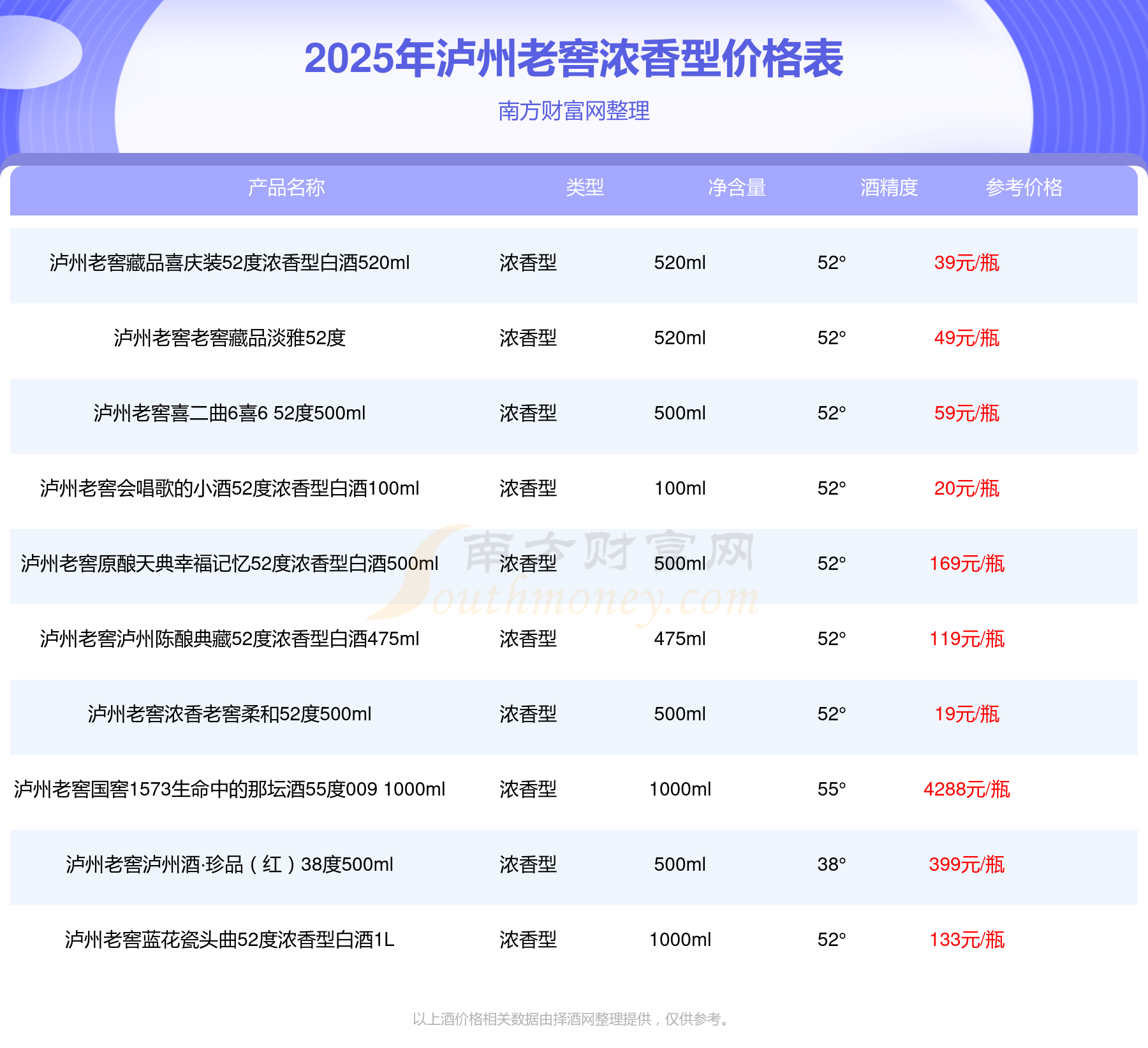 2025年,泸州老窖浓香型酒价格最高的是泸州老窖国窖1573春酿鼠兆丰年E 55度,参考价17999元,最低的是泸州老窖45度五洲醉8窖经典小酒版浓香型100ml,参考价10元,价格高低差为17989元。