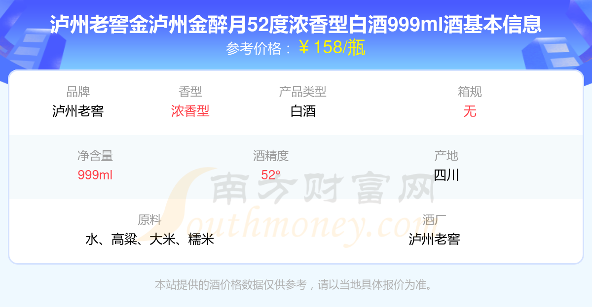 泸州老窖金泸州金醉月52度浓香型白酒999ml基本信息
