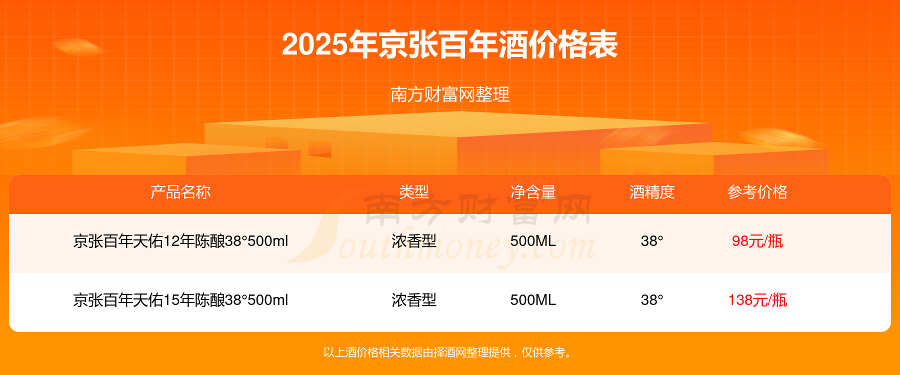 2025年,京张百年天佑15年陈酿38°500ml、京张百年天佑12年陈酿38°500ml等京张百年酒价格如下:京张百年天佑15年陈酿38°500ml参考价138元/瓶、京张百年天佑12年陈酿38°500ml参考价98元/瓶。