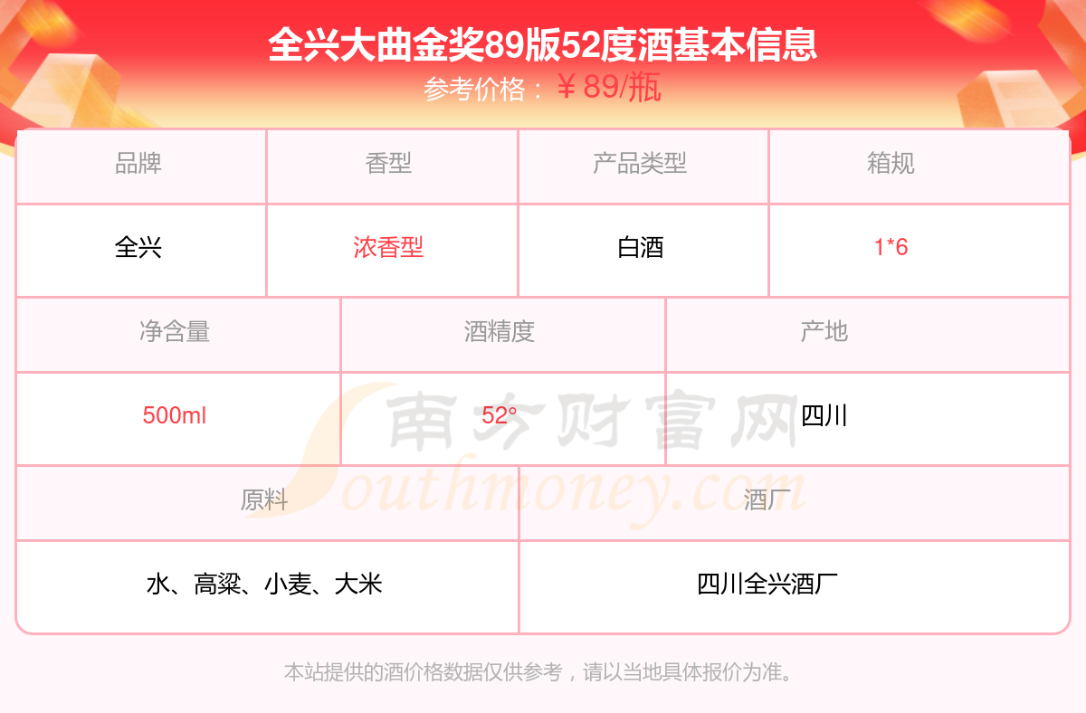 全兴大曲金奖89版52度基本信息