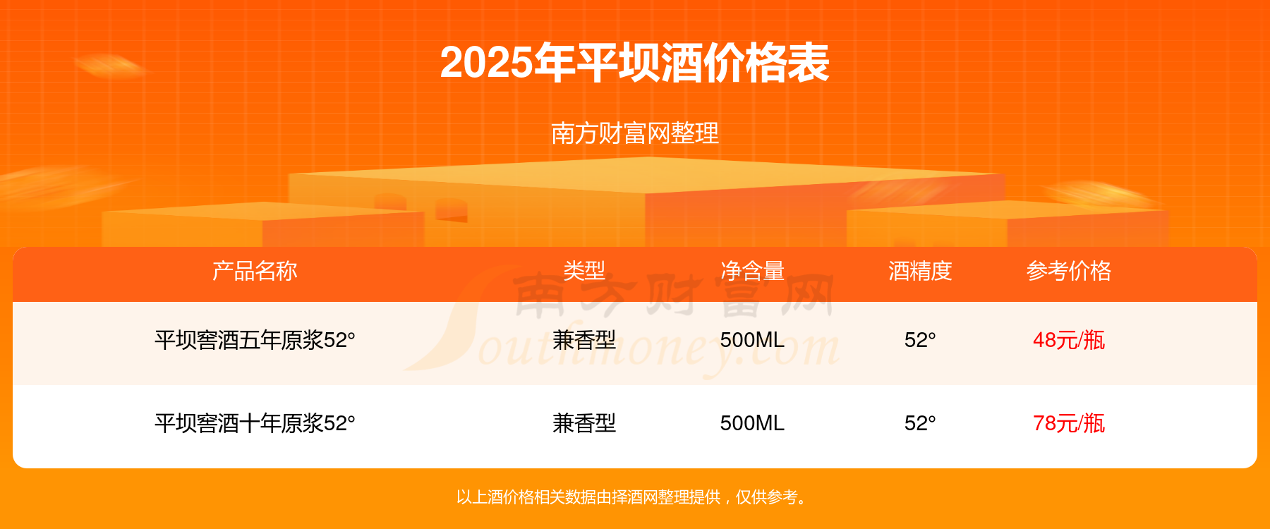 2025年平坝酒平坝窖酒十年原浆52°、平坝窖酒五年原浆52°等最新价格如下: