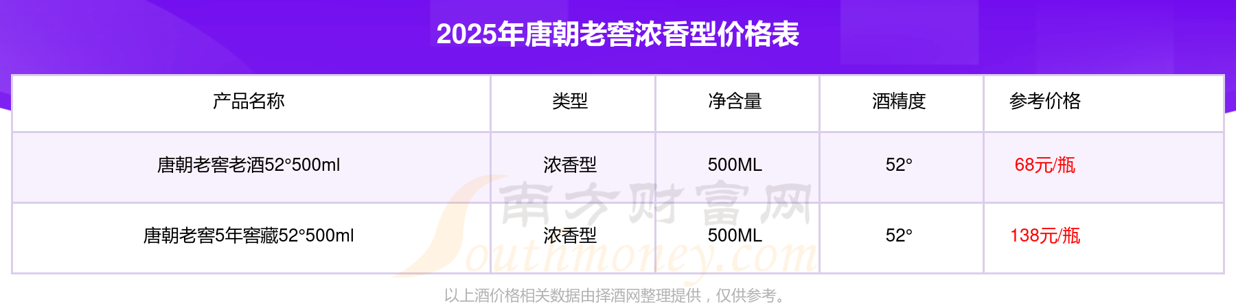 2025唐朝老窖浓香型酒最新价格:唐朝老窖5年窖藏52°500ml参考价138元/瓶、唐朝老窖老酒52°500ml参考价68元/瓶。