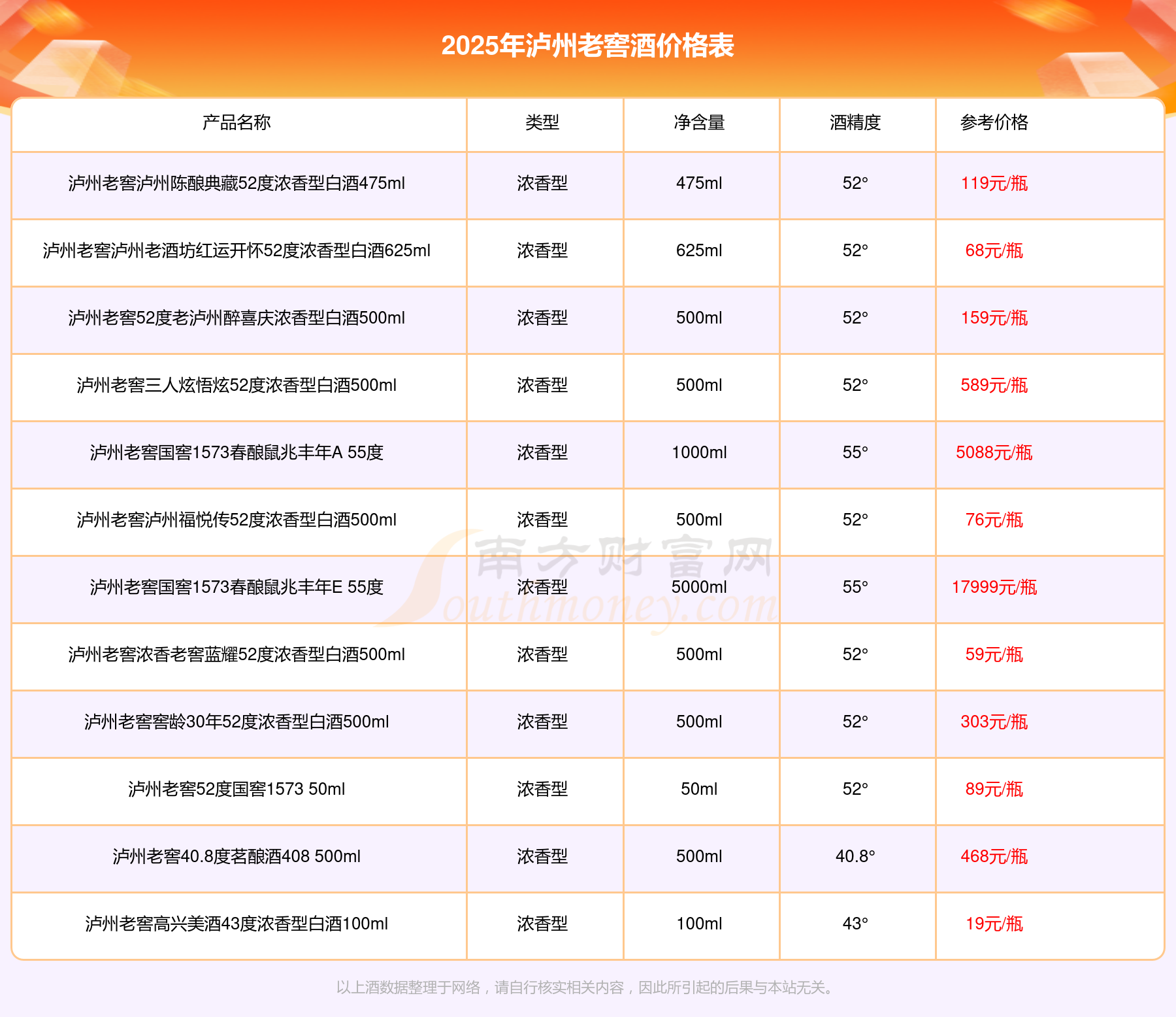 2025泸州老窖酒最新价格:泸州老窖国窖1573春酿鼠兆丰年E 55度参考价17999元/瓶、泸州老窖国窖1573生命中的那坛酒55度014参考价9999元/瓶、泸州老窖国窖1573春酿鼠兆丰年A 55度参考价5088元/瓶。