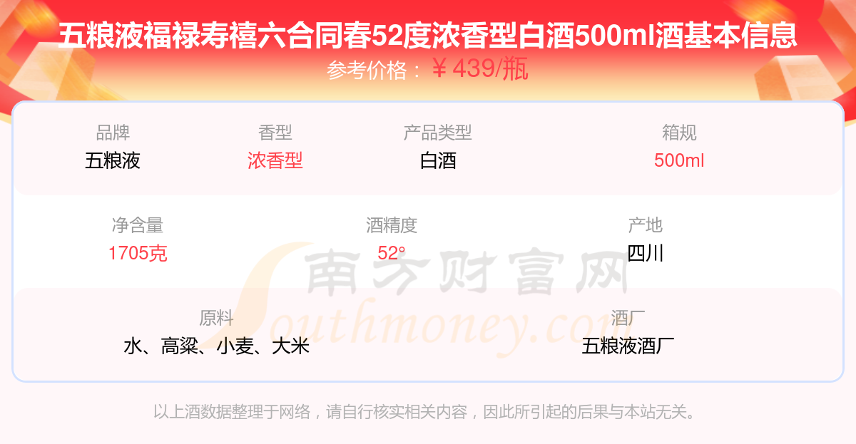 五粮液福禄寿禧六合同春52度浓香型白酒500ml基本信息