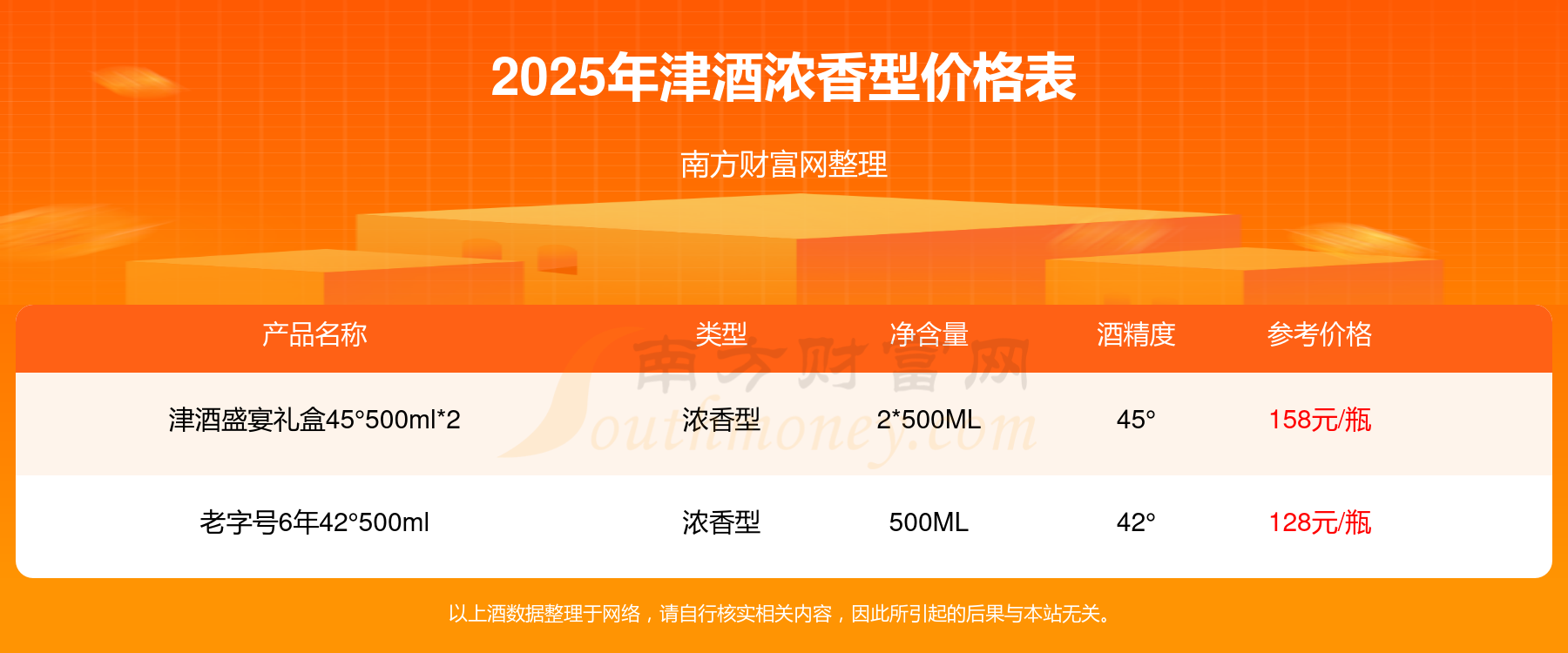 2025津酒浓香型酒最新价格:津酒盛宴礼盒45°500ml*2参考价158元/瓶、老字号6年42°500ml参考价128元/瓶。