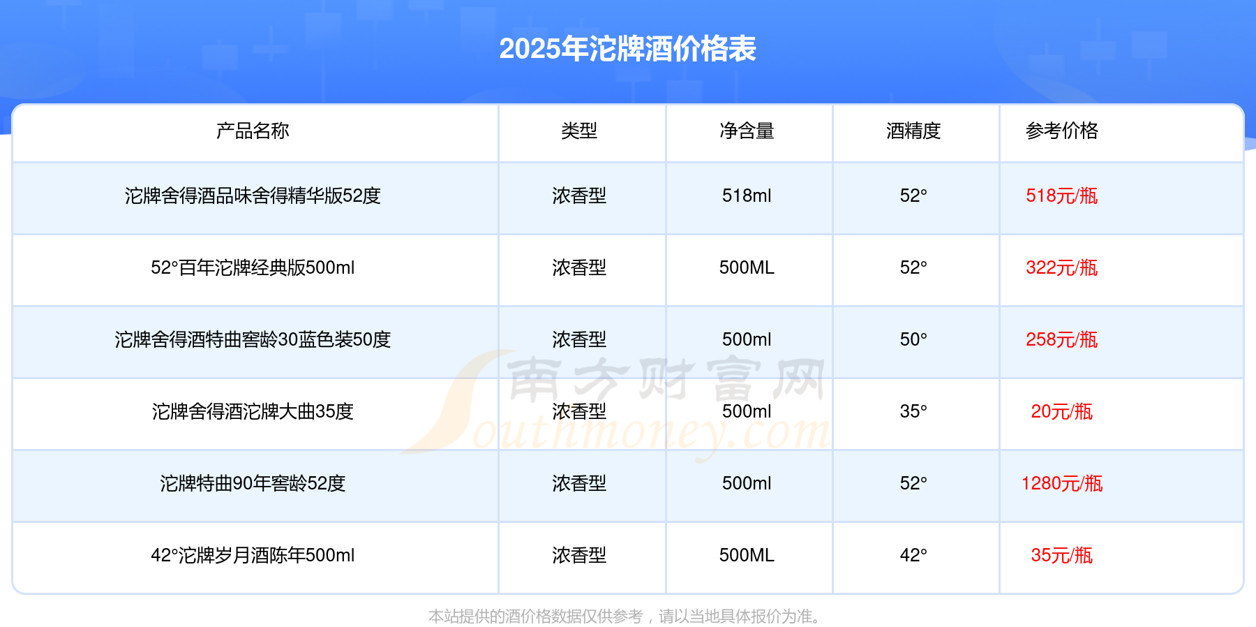 2025年沱牌酒沱牌特曲90年窖龄52度、沱牌舍得酒品味舍得精华版52度、52°百年沱牌经典版500ml、沱牌舍得酒特曲窖龄30蓝色装50度、42°沱牌岁月酒陈年500ml、沱牌舍得酒沱牌大曲35度等最新价格如下: