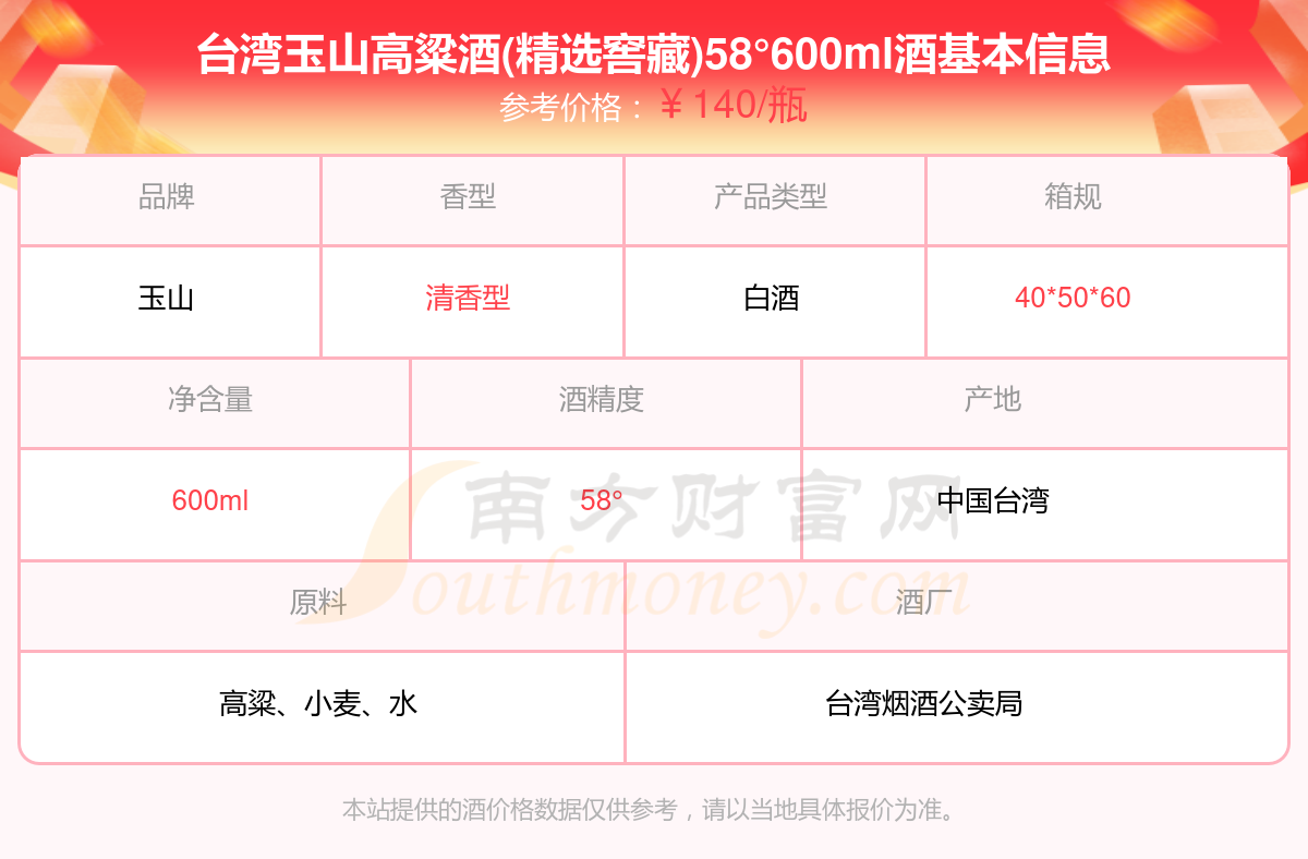 台湾玉山高粱酒(精选窖藏)58°600ml基本信息