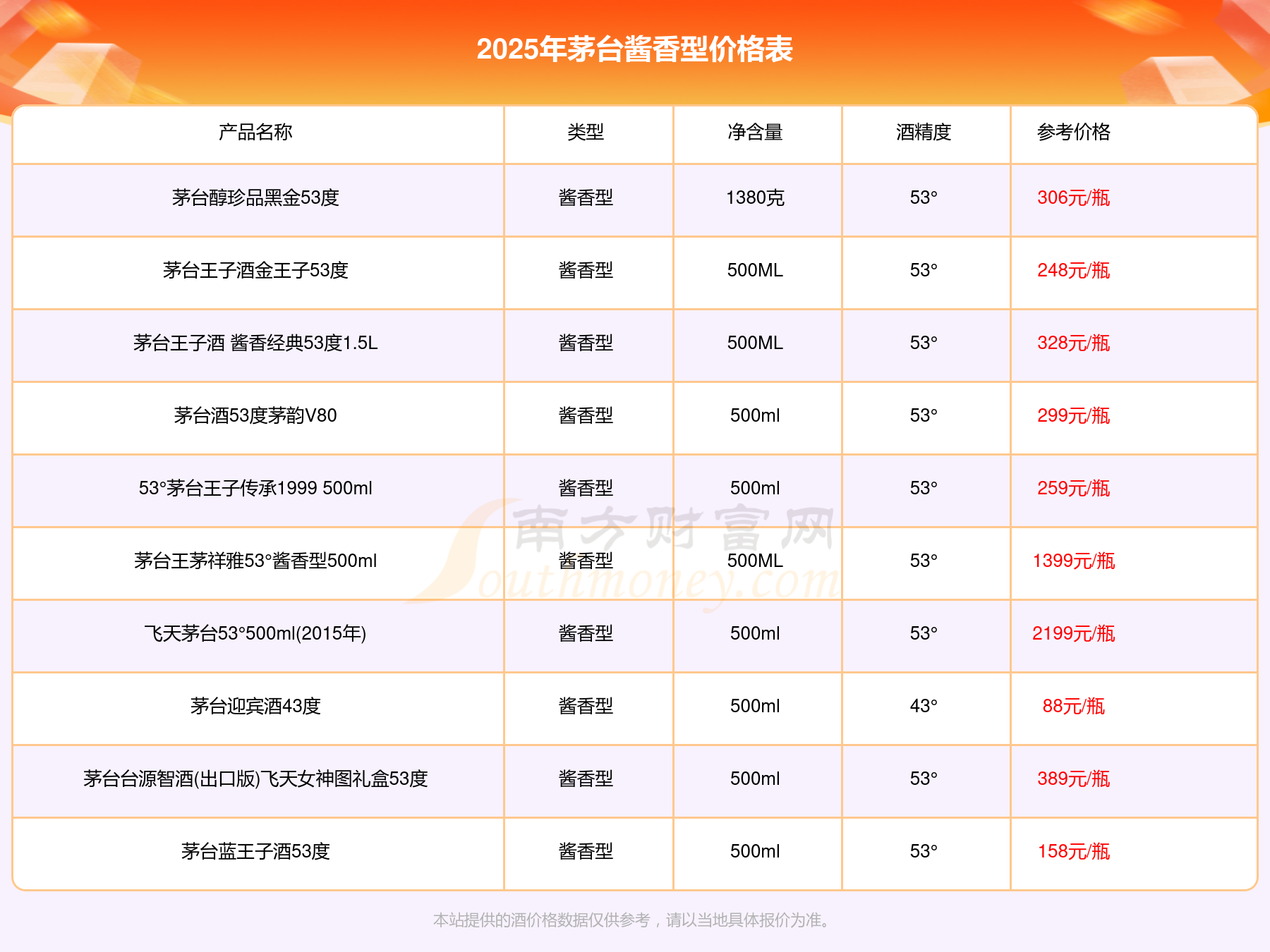 2025年,华茅鉴藏 酱香型白酒 3L 53°、53度五星茅台生肖酒丁酉鸡年、贵州茅台己亥猪年生肖酒53°500ml、53度五星茅台生肖酒戊戌狗年、飞天茅台53°500ml(2015年)等茅台酱香型酒价格如下:华茅鉴藏 酱香型白酒 3L 53°参考价8388元/瓶、53度五星茅台生肖酒丁酉鸡年参考价2798元/瓶、贵州茅台己亥猪年生肖酒53°500ml参考价2699元/瓶、53度五星茅台生肖酒戊戌狗年参考价2698元/瓶、飞天茅台53°500ml(2015年)参考价2199元/瓶。