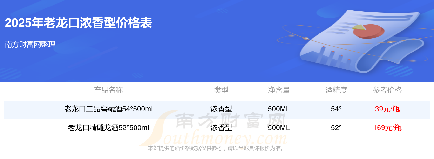 2025年,老龙口浓香型酒价格最高的是老龙口精雕龙酒52°500ml,参考价169元,最低的是老龙口二品窖藏酒54°500ml,参考价39元,价格高低差为130元。