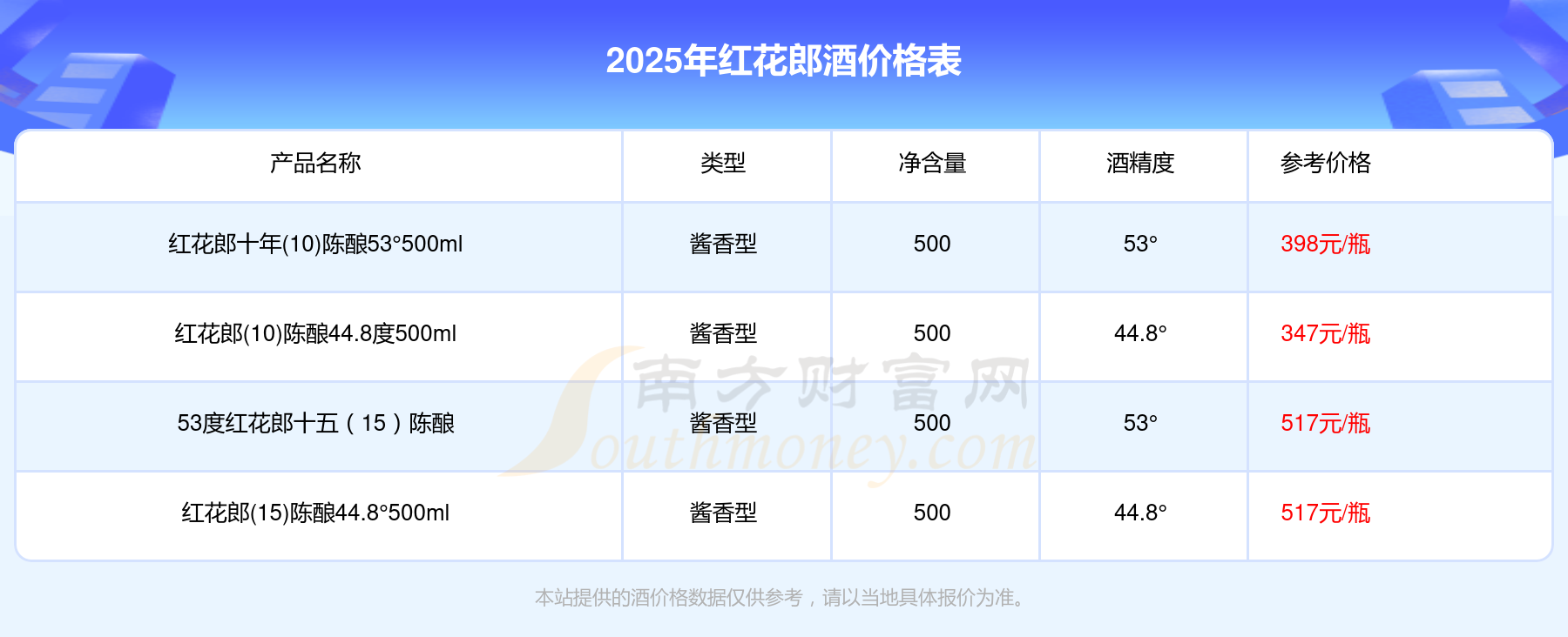 53度红花郎十五(15)陈酿参考价517元/瓶、红花郎(15)陈酿44.8°500ml参考价517元/瓶、红花郎十年(10)陈酿53°500ml参考价398元/瓶、红花郎(10)陈酿44.8度500ml参考价347元/瓶。
