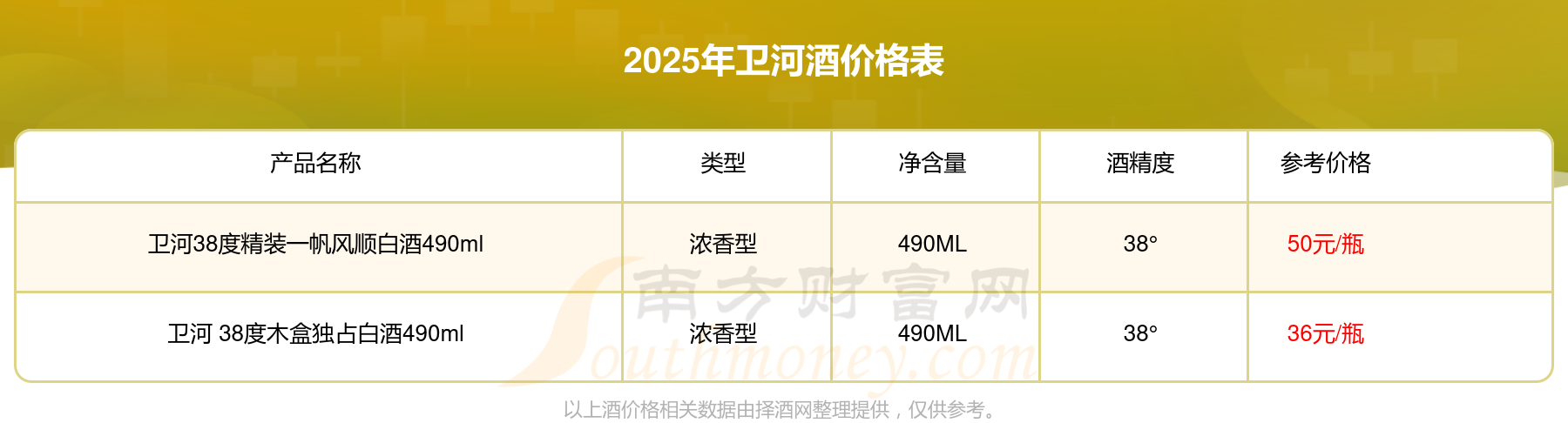 卫河38度精装一帆风顺白酒490ml参考价50元/瓶、卫河 38度木盒独占白酒490ml参考价36元/瓶。